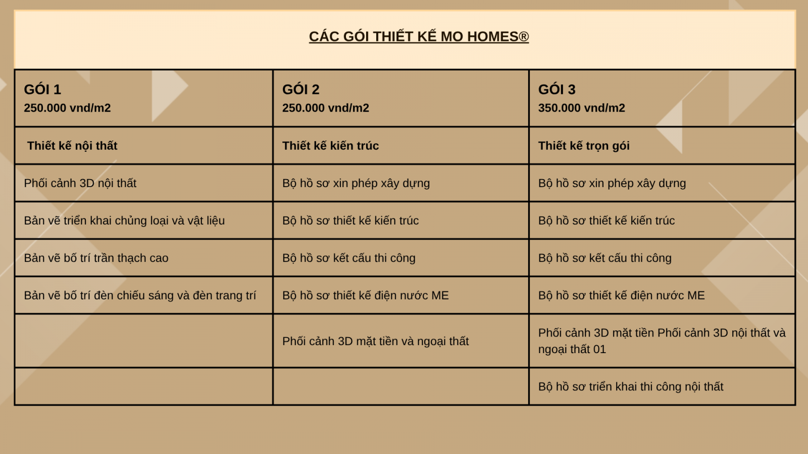 Dưới đây là bảng giá thiết kế kiến trúc, thiết kế nội thất và thiết kế trọn gói loại hình nhà phố của MO HOMES tại khu vực miền Nam. Trong quá trình trao đổi tư vấn với gia chủ, MO HOMES sẽ báo giá chi tiết hơn dựa trên công năng của ngôi nhà, phong cách thiết kế hoặc vật tư thi công mà gia chủ lựa chọn.