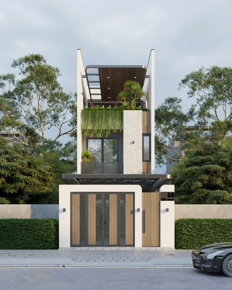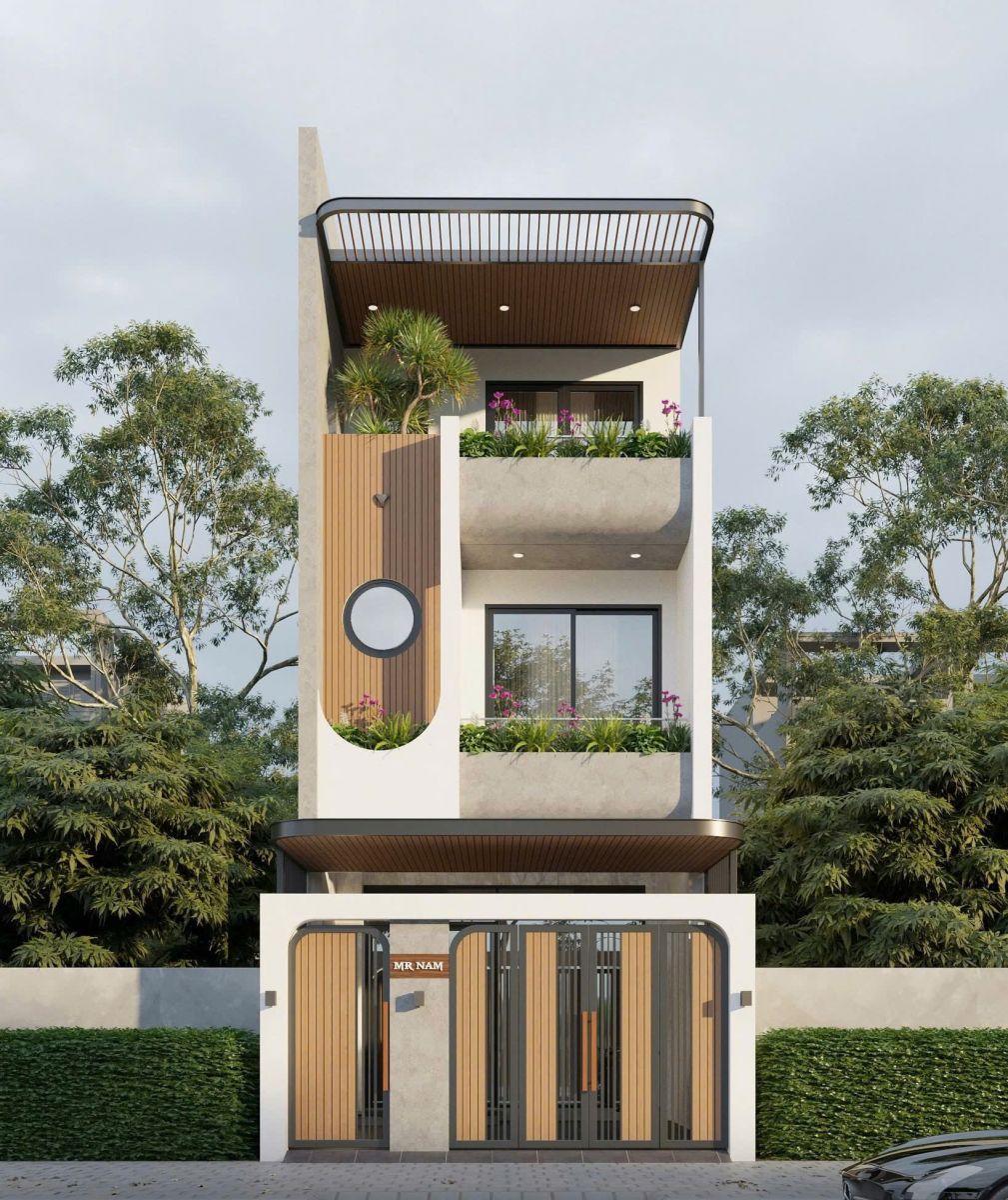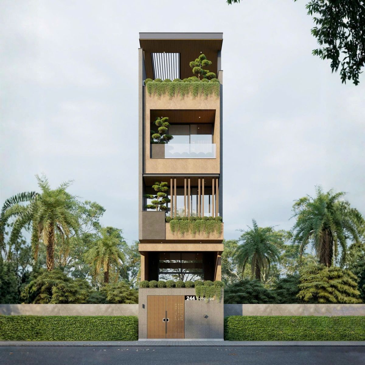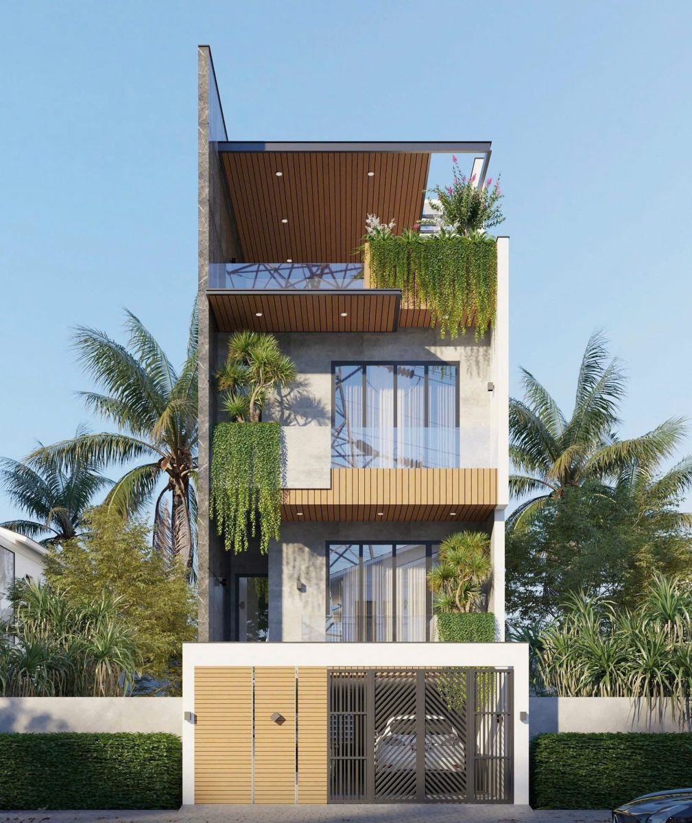 Mẫu nhà 4 tầng mặt tiền 5m được thiết kế theo phong cách tối giản, sử dụng gam màu trung tính kết hợp vật liệu gỗ, tạo nên không gian sống ấm áp, tinh tế. Lối kiến trúc gọn gàng giúp công trình giữ được vẻ đẹp bền vững theo thời gian, phù hợp với gia chủ yêu thích sự nhẹ nhàng và thanh lịch.