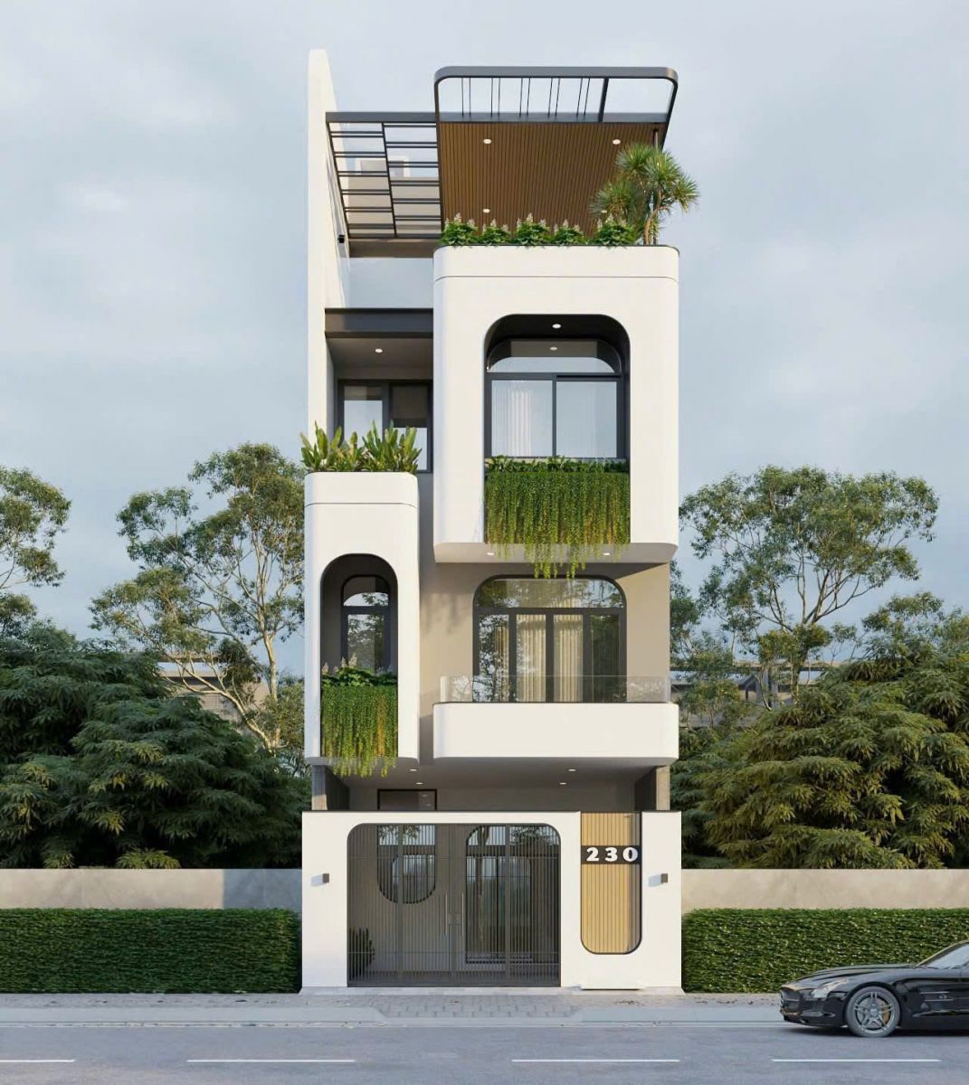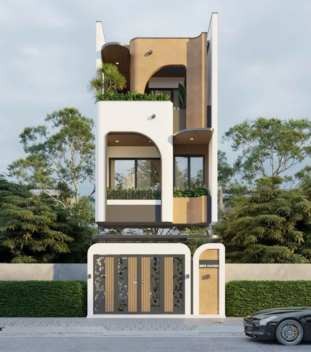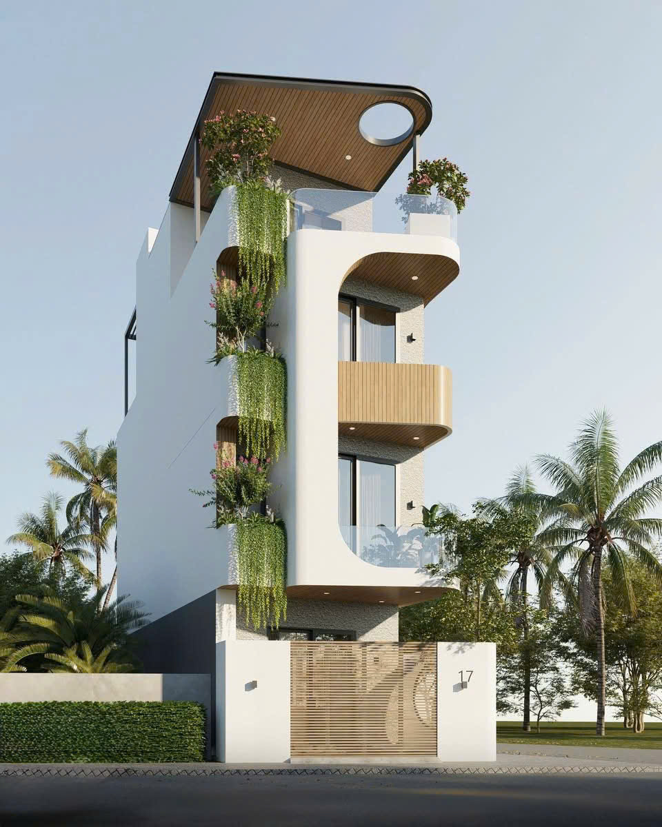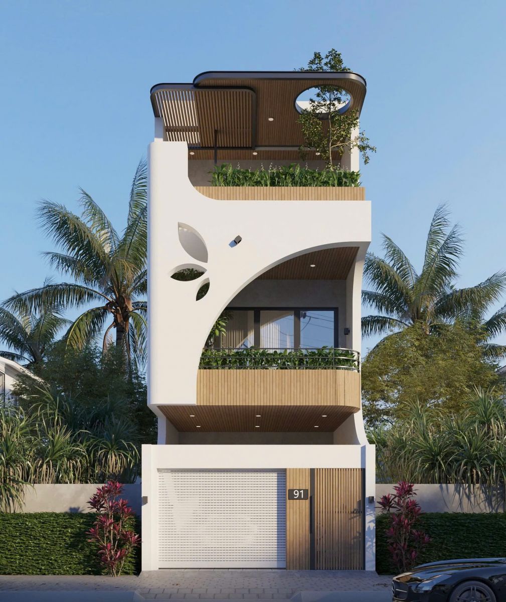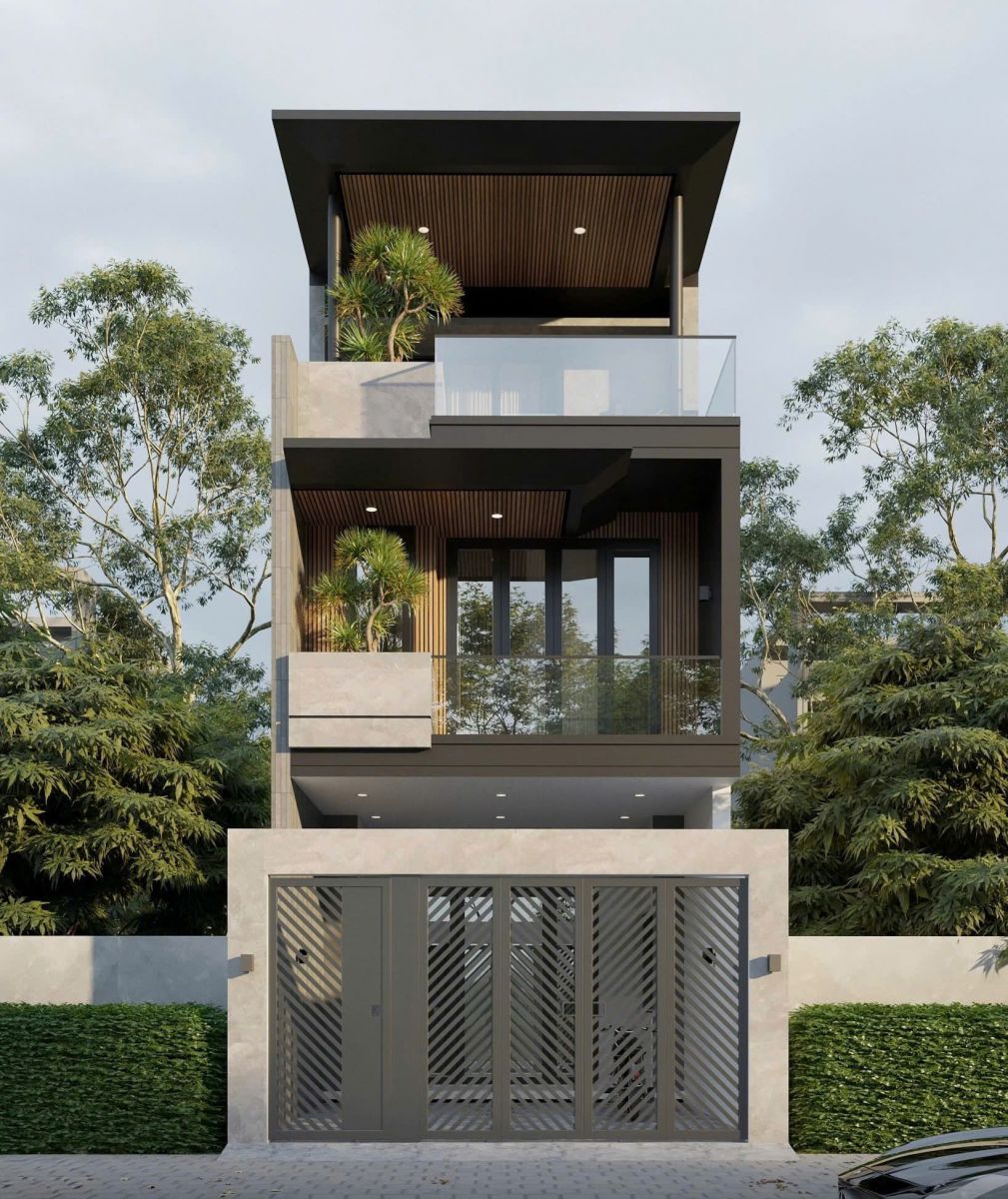 Mẫu nhà 5×16 3 tầng được thiết kế với mặt tiền hiện đại, sử dụng nhiều cửa kính lớn giúp tăng khả năng thông gió và lấy sáng tự nhiên. Màu sắc chủ đạo gồm trắng, xi măng và gỗ, mang lại cảm giác sang trọng và bền vững.