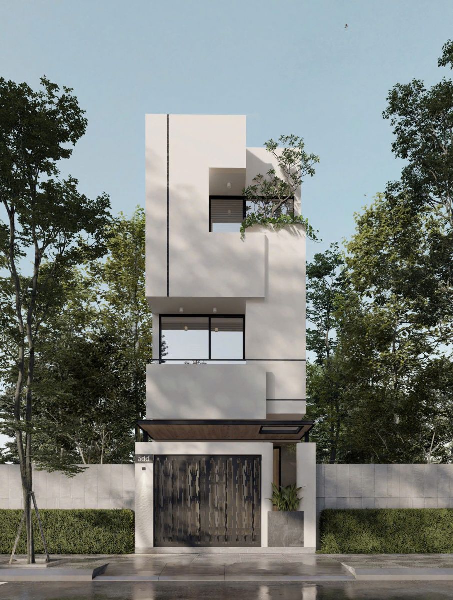 Mẫu nhà 5×16 3 tầng này nổi bật với sự kết hợp của các khối hộp kiến trúc hiện đại, tông màu trắng – xám chủ đạo cùng vật liệu ốp đá mặt tiền. Ban công rộng kết hợp cây xanh giúp tăng tính thẩm mỹ và cải thiện vi khí hậu.