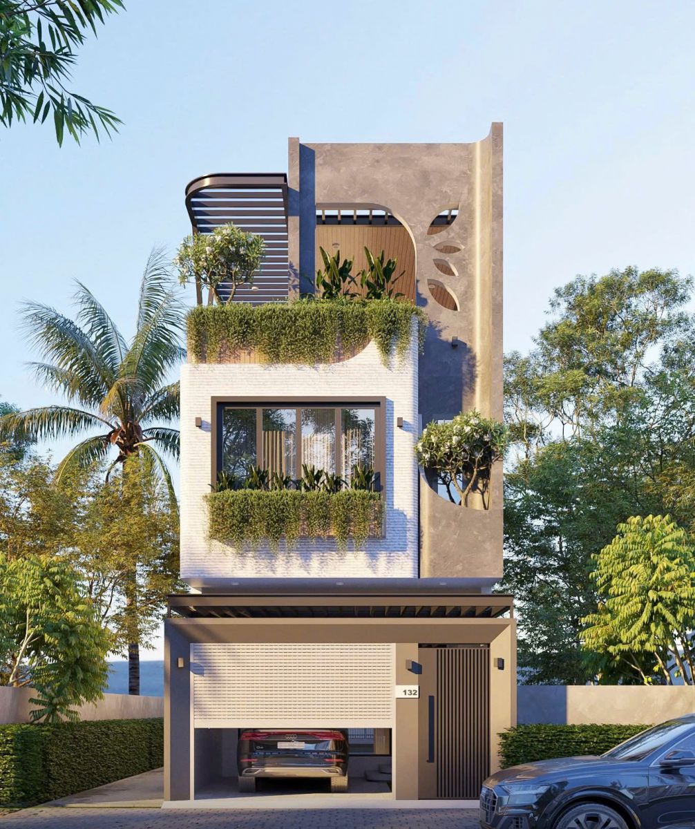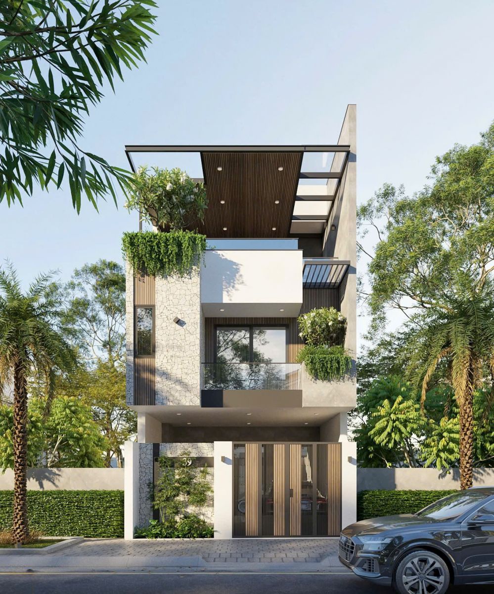 Điểm nhấn của mẫu nhà này nằm ở mặt tiền mạnh mẽ, kết hợp ban công và lam chắn nắng, vừa tạo chiều sâu kiến trúc vừa giúp điều tiết ánh sáng, gió tự nhiên.