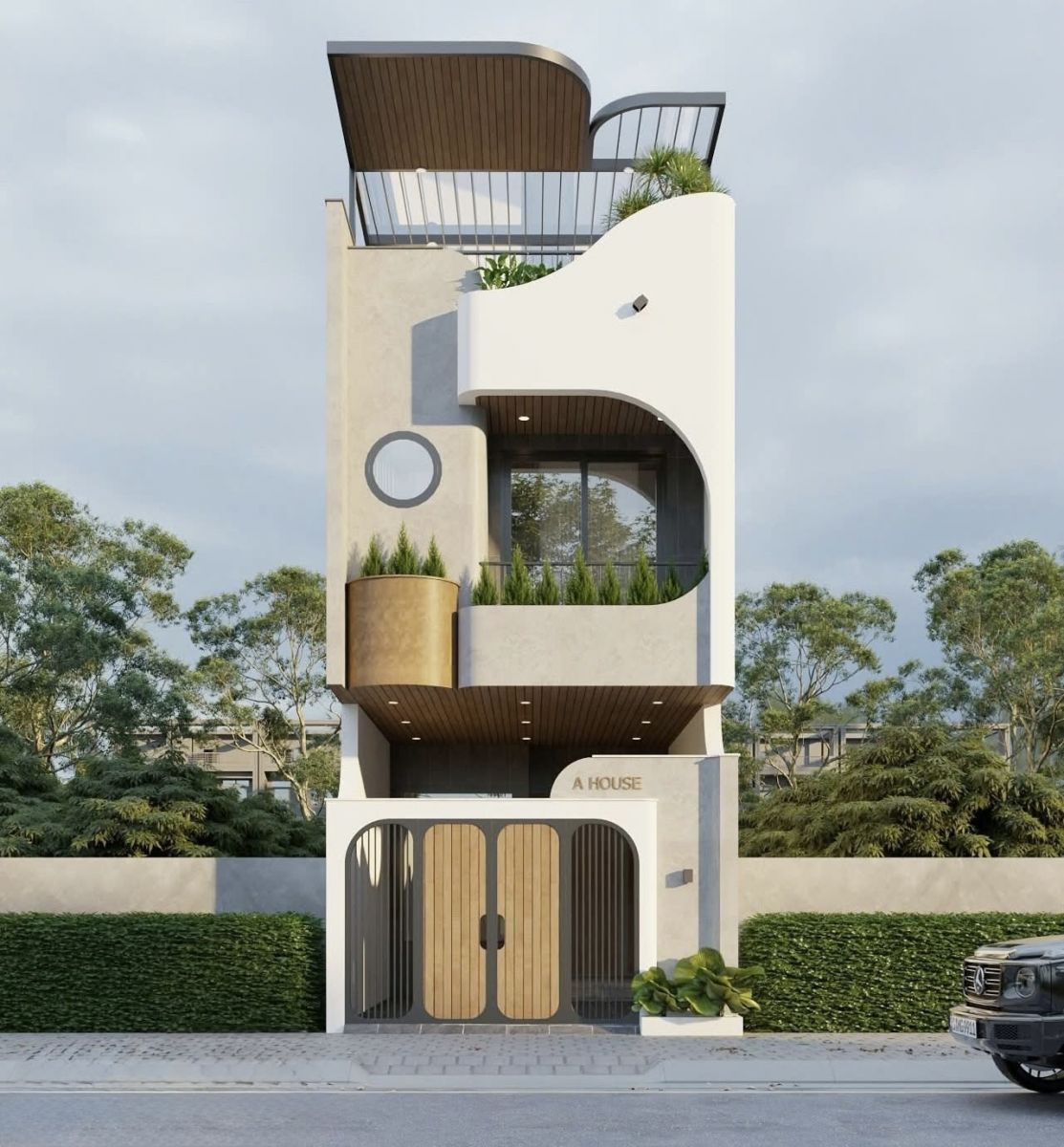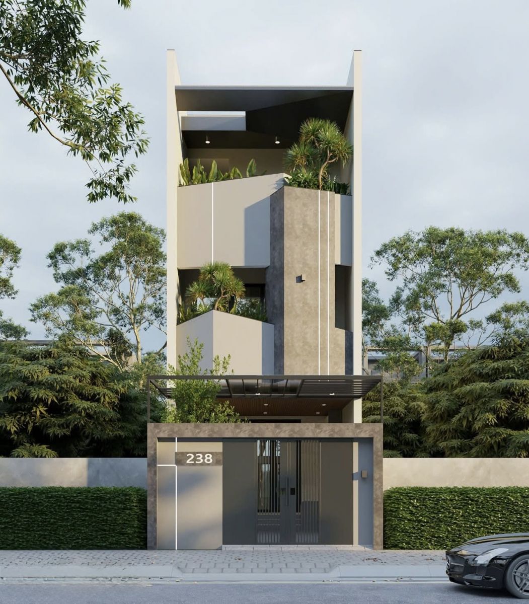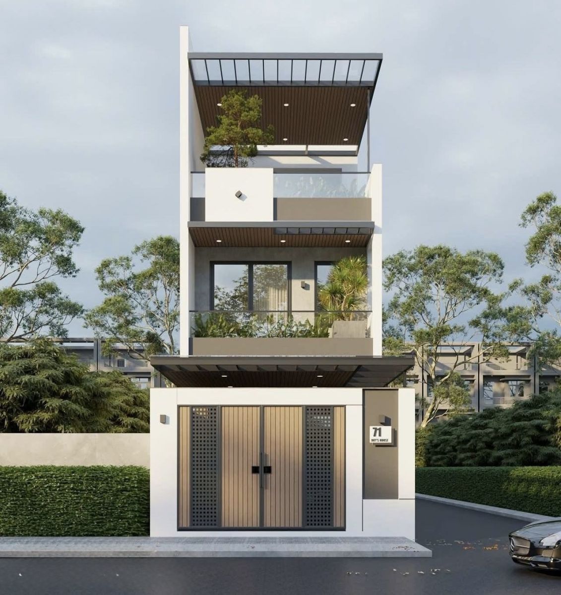Điểm nổi bật của mẫu nhà lệch tầng 1 trệt 2 lầu theo xu hướng xanh là sự kết nối chặt chẽ giữa không gian sống và thiên nhiên. Ngoại thất sử dụng nhiều khoảng mở, ban công và cây xanh giúp điều hòa không khí, mang lại cảm giác mát mẻ, dễ chịu.