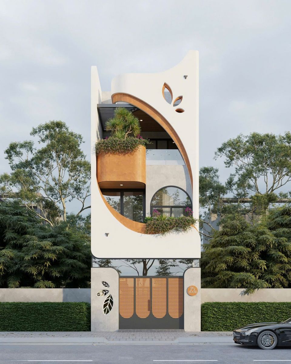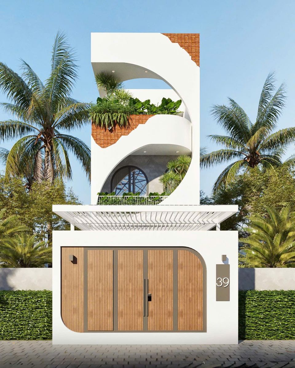 Thiết kế theo tinh thần tối giản hiện đại, công trình gây ấn tượng bởi hình khối vuông vức, đường nét tinh gọn và bảng màu trung tính. Hệ lam che nắng kết hợp cây xanh mặt tiền giúp giảm bức xạ nhiệt, mang lại không gian sống mát mẻ, dễ chịu.