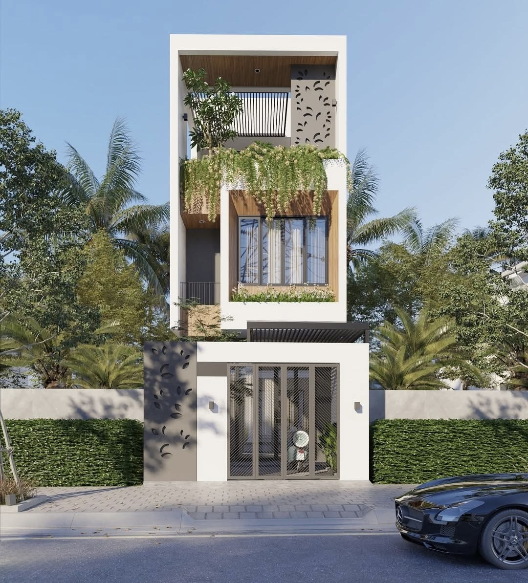 Với chiều ngang 4m, việc tạo cảm giác thông thoáng là yếu tố quan trọng. Mẫu thiết kế nhà 3 tầng 4x20m hiện đại sử dụng mảng tường lớn kết hợp kính và lam gỗ, giúp mặt tiền có chiều sâu và giảm cảm giác hẹp ngang.