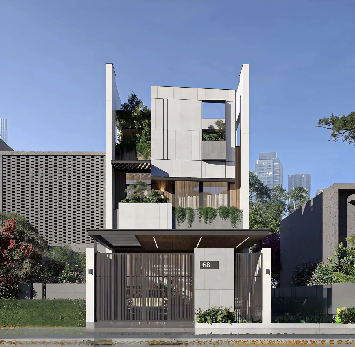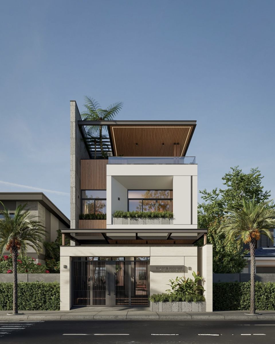 Mẫu nhà 3 tầng hiện đại với gam màu trung tính nhẹ nhàng. Các không gian được sắp xếp khoa học, thoáng mở.