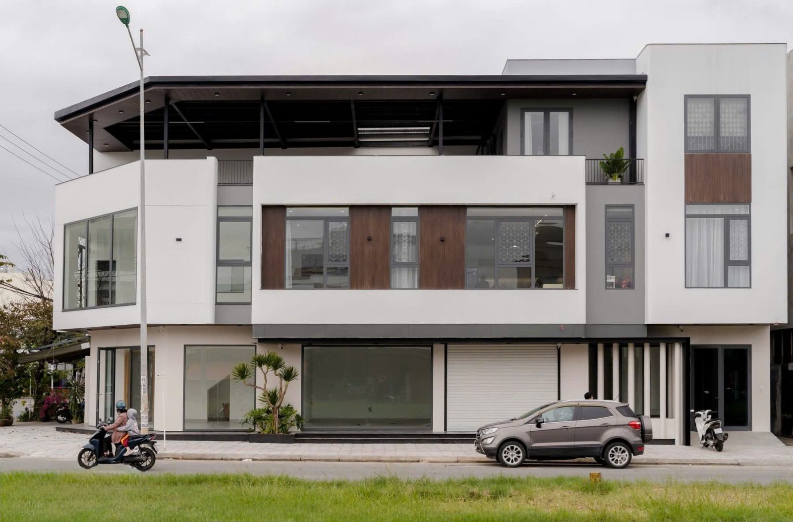 Mặt tiền thể hiện rõ tinh thần hiện đại với hình khối mạnh mẽ, hệ cửa kính lớn giúp tối đa ánh sáng tự nhiên. Các ban công xanh tạo sự sinh động và gần gũi với thiên nhiên.