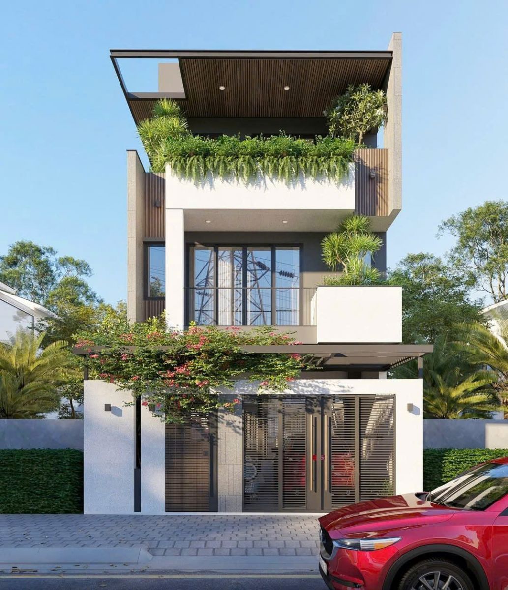 Mẫu nhà nổi bật với đường cong mềm mại, kết hợp các mảng khối hiện đại tạo nên diện mạo ngoại thất khác biệt. Cây xanh được bố trí tinh tế tại ban công các tầng giúp không gian luôn tươi mát và tràn đầy sinh khí.