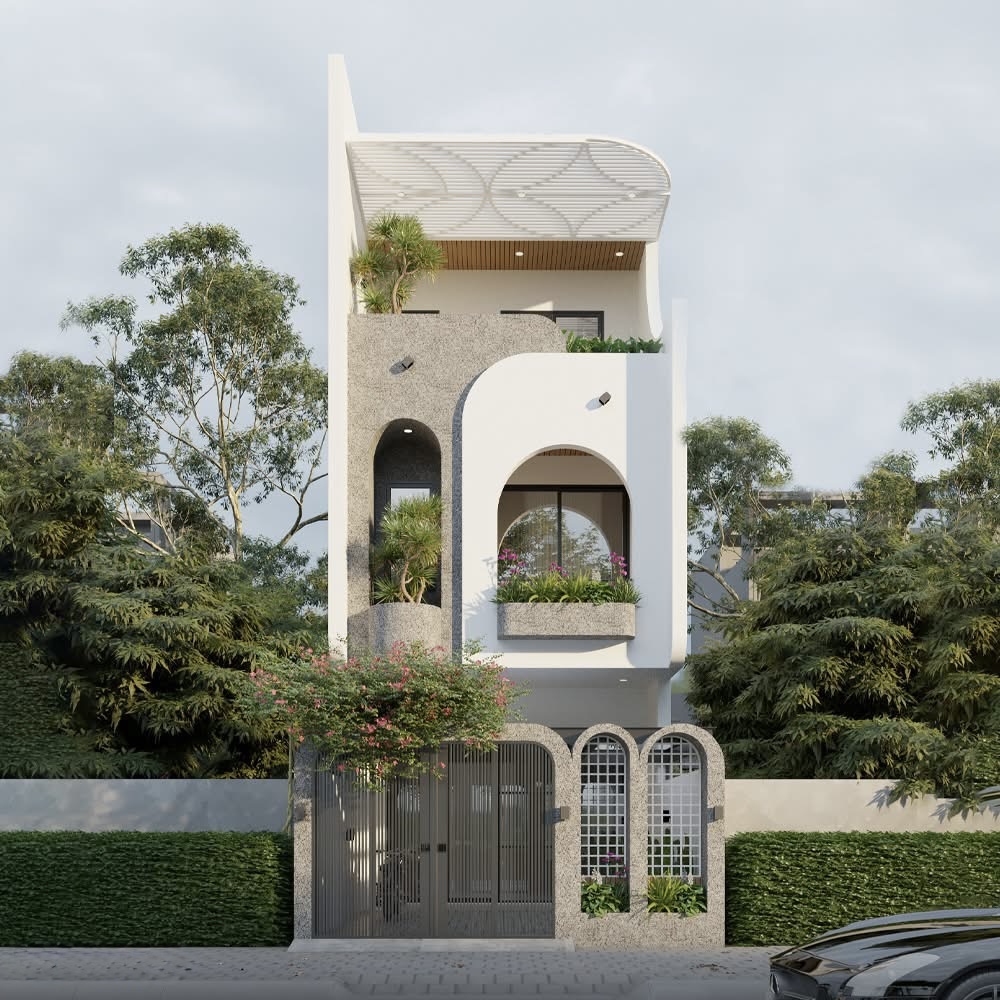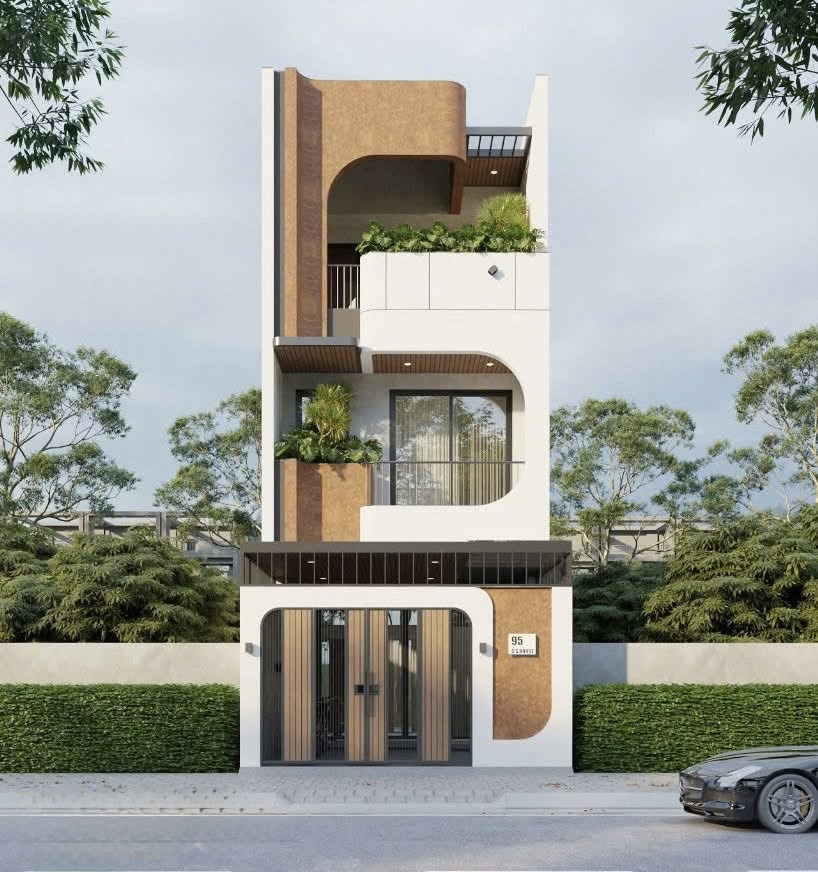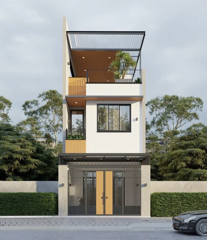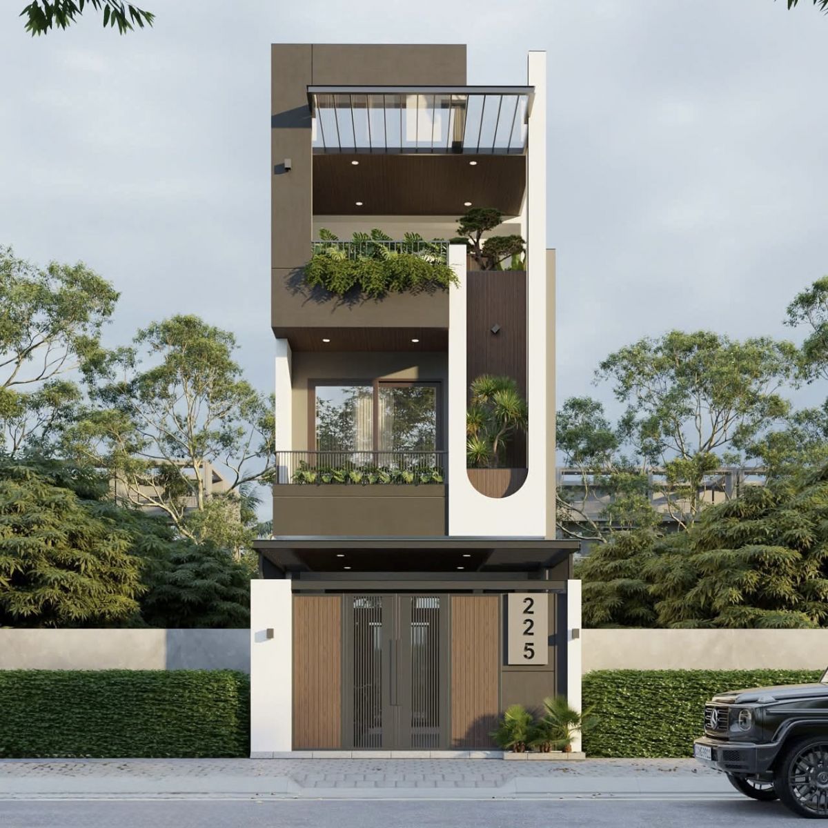 Điểm nổi bật của mẫu nhà lệch tầng 1 trệt 2 lầu theo xu hướng xanh là sự kết nối chặt chẽ giữa không gian sống và thiên nhiên. Ngoại thất sử dụng nhiều khoảng mở, ban công và cây xanh giúp điều hòa không khí, mang lại cảm giác mát mẻ, dễ chịu.