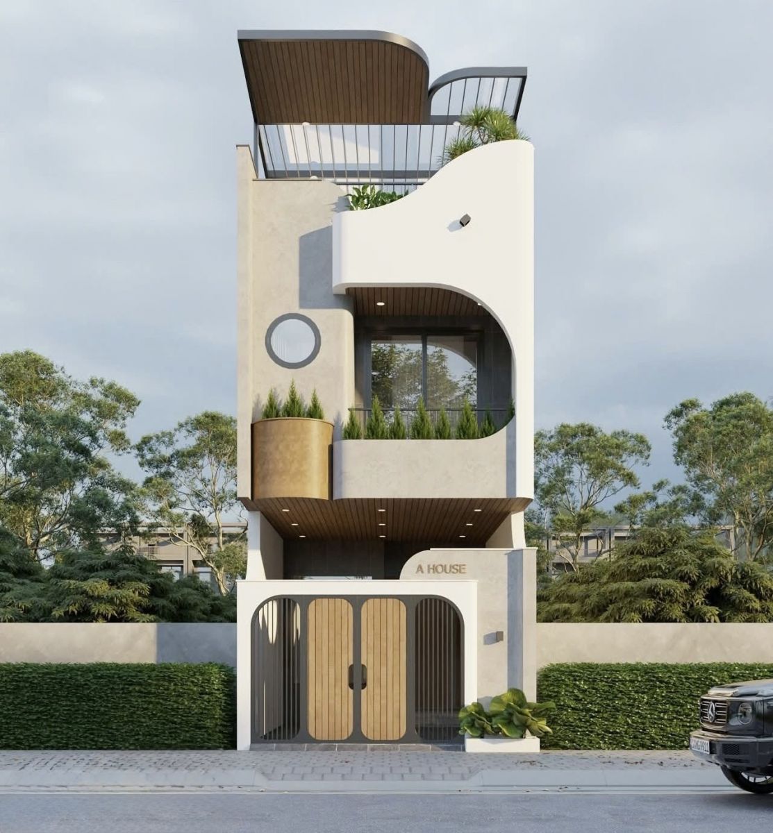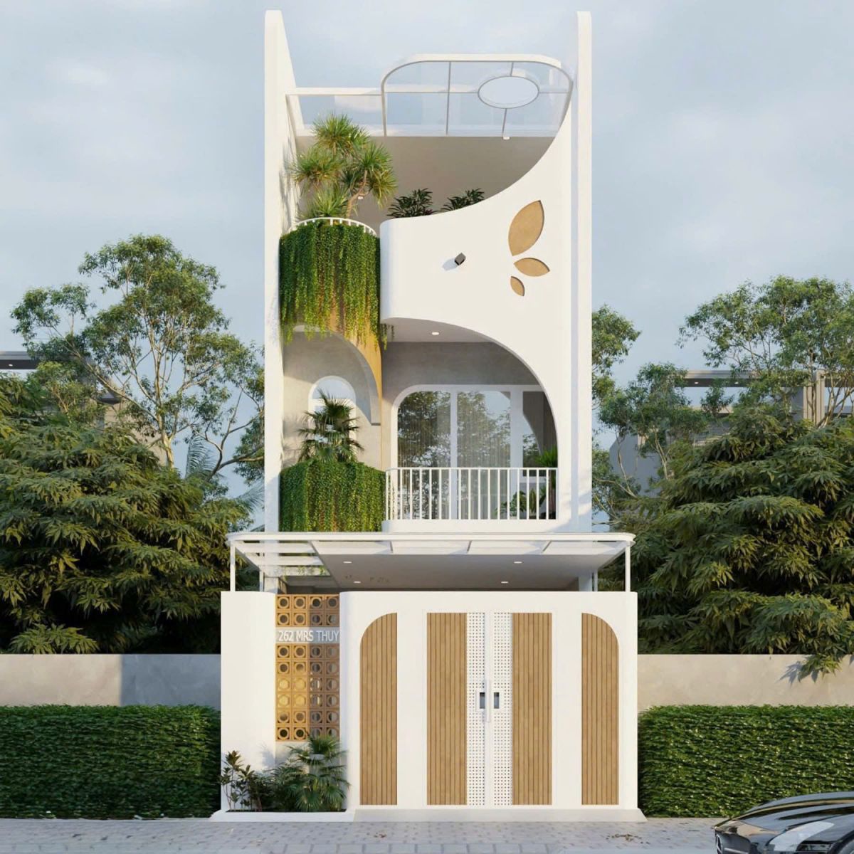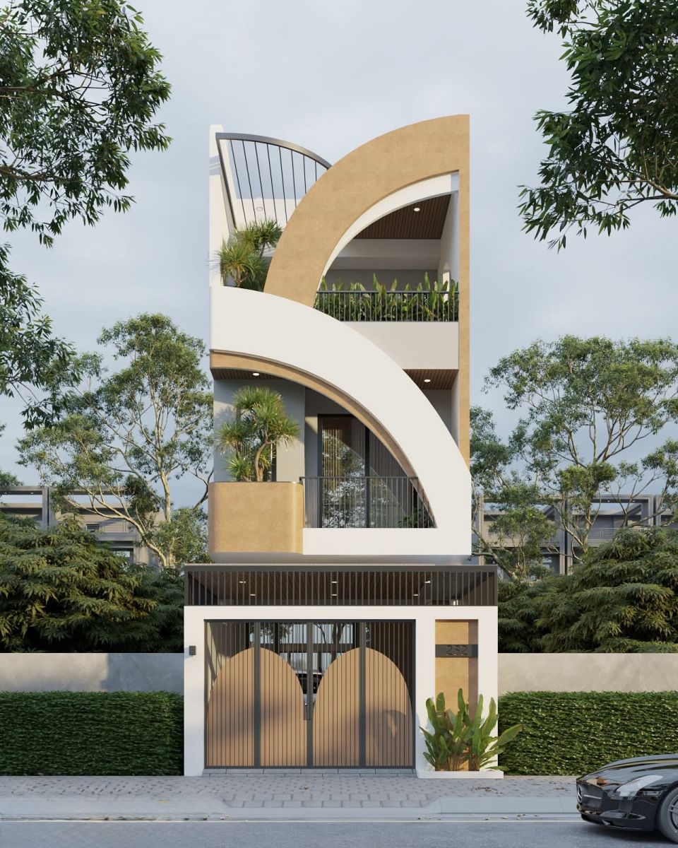 Khác biệt với phong cách truyền thống, thiết kế mặt tiền của ngôi nhà này nổi bật với những đường cong mềm mại, tạo ra một vẻ đẹp duyên dáng và quyến rũ. Kiến trúc đường cong mềm mại của ban công, bồn cây,… tạo sự đồng bộ và ấn tượng cho ngoại thất ngôi nhà. Bên trong nội thất mang phong cách hiện đai và tối giản và thoáng mát theo mong muốn của gia chủ.