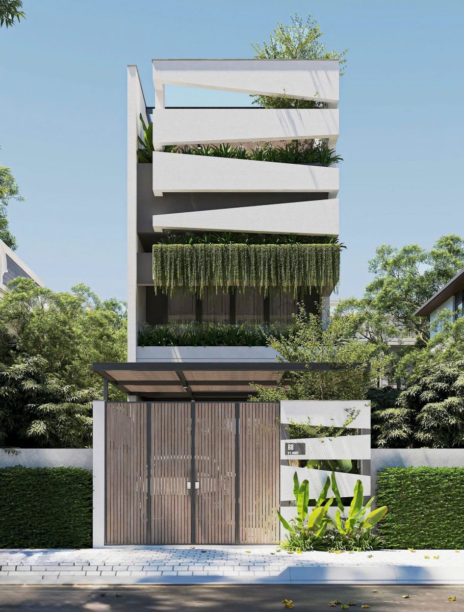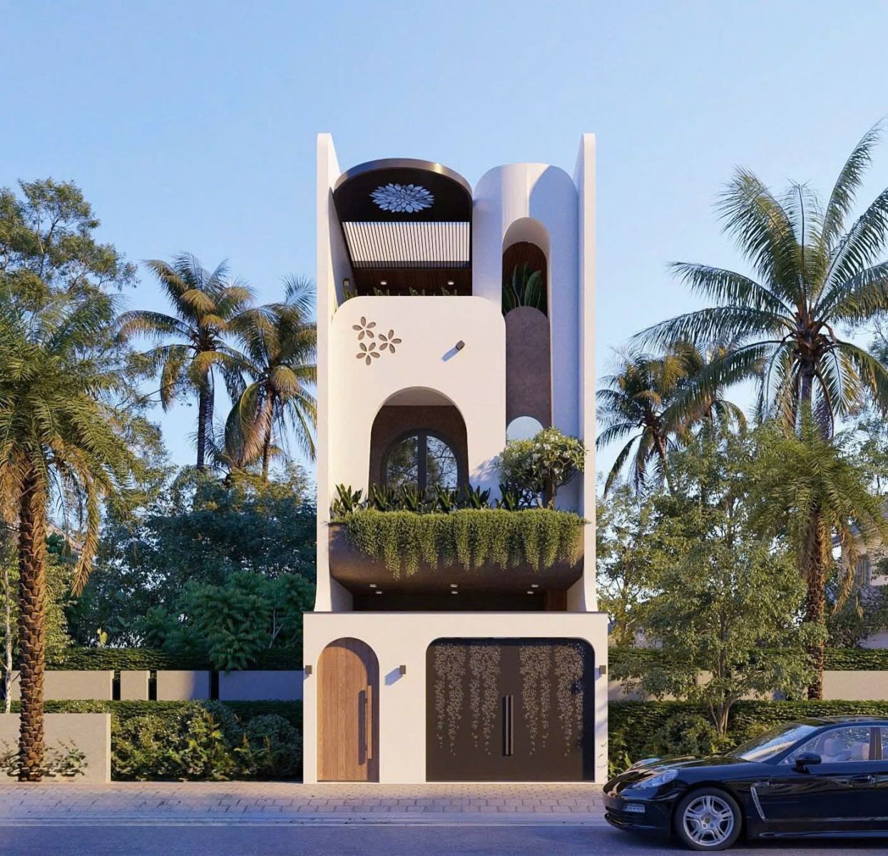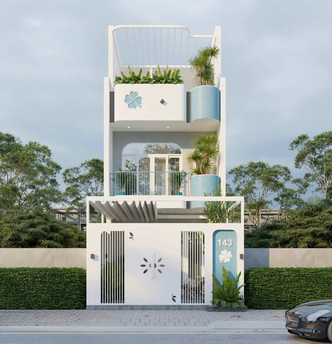 Khác biệt với phong cách truyền thống, thiết kế mặt tiền của ngôi nhà này nổi bật với những đường cong mềm mại, tạo ra một vẻ đẹp duyên dáng và quyến rũ. Kiến trúc đường cong mềm mại của ban công, bồn cây,… tạo sự đồng bộ và ấn tượng cho ngoại thất ngôi nhà. Bên trong nội thất mang phong cách hiện đai và tối giản và thoáng mát theo mong muốn của gia chủ.