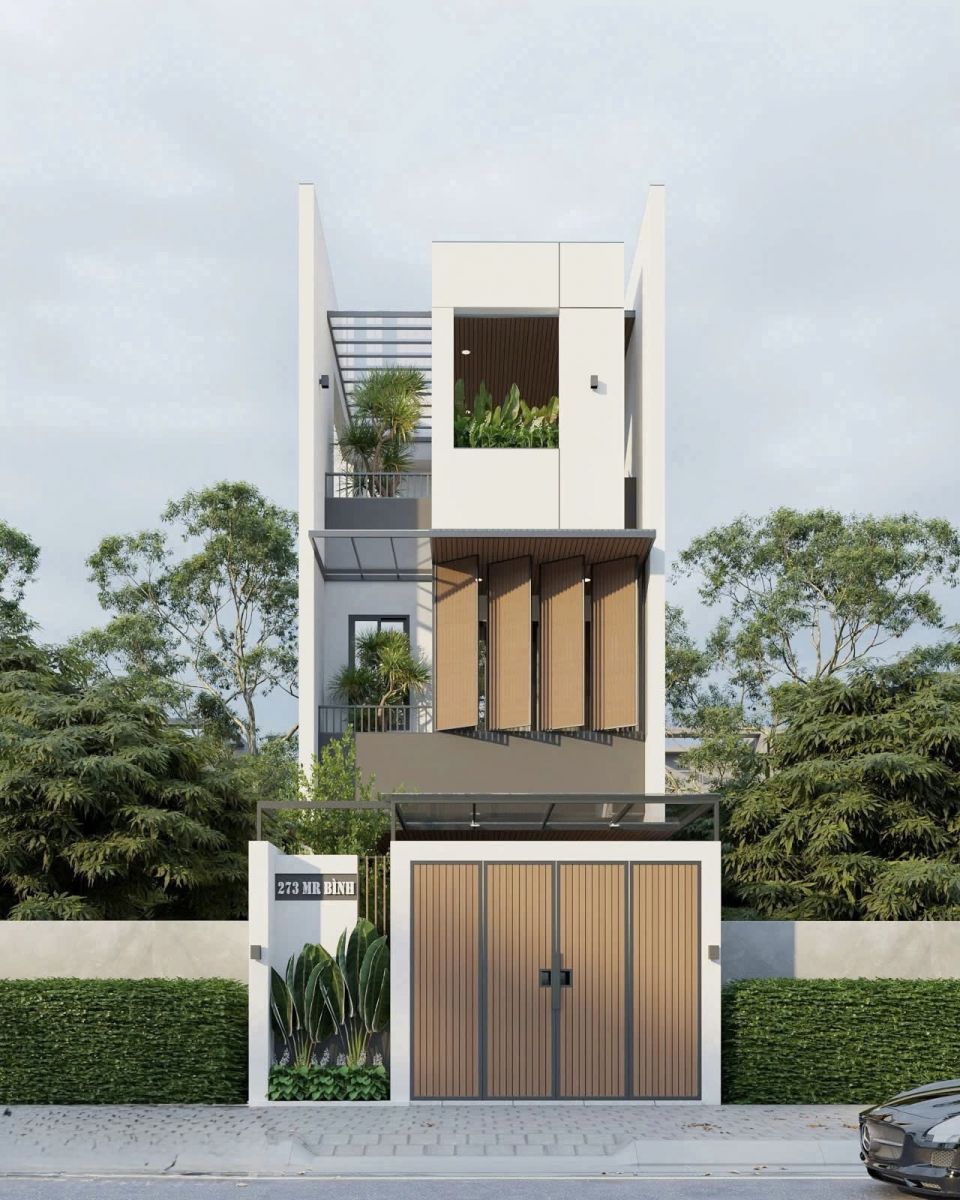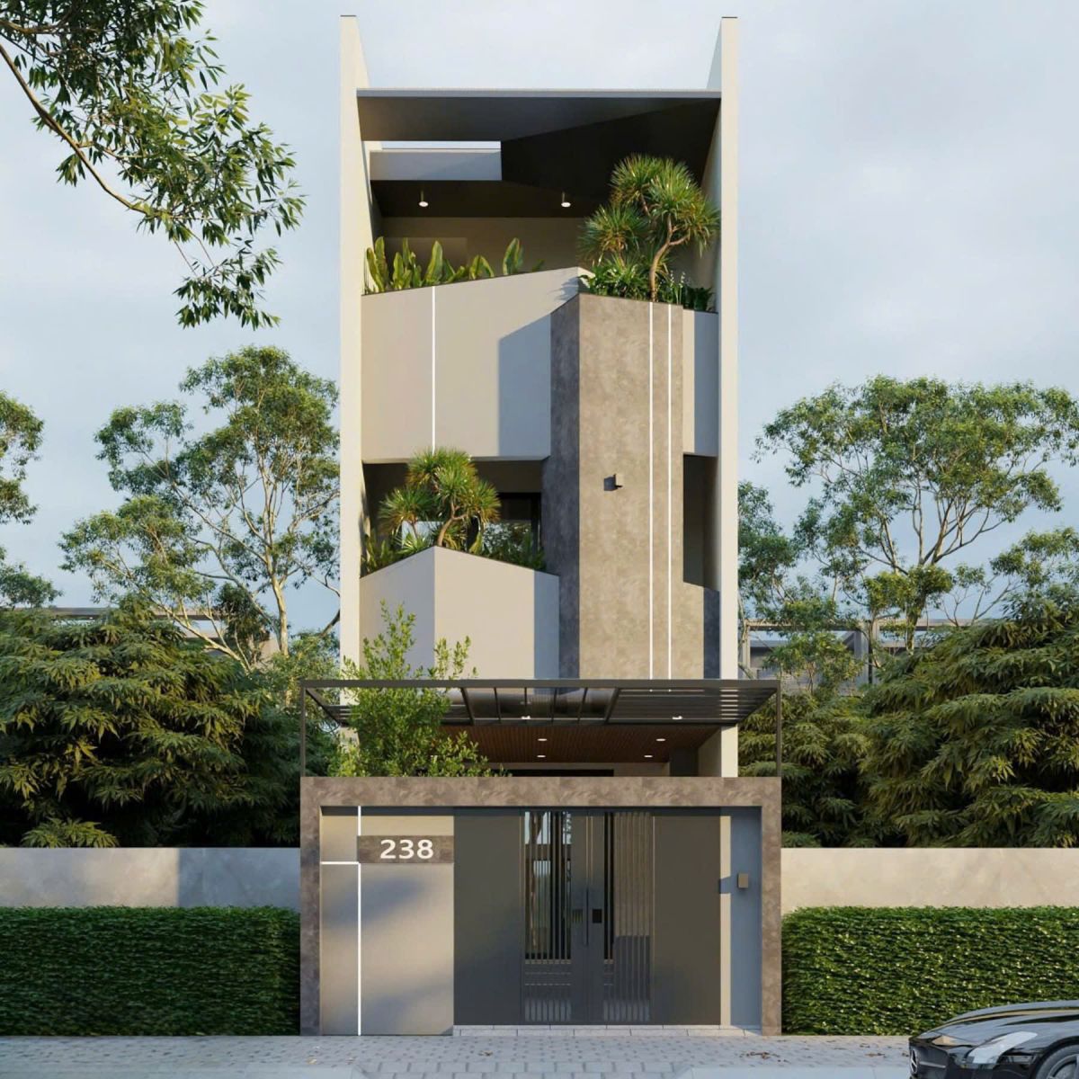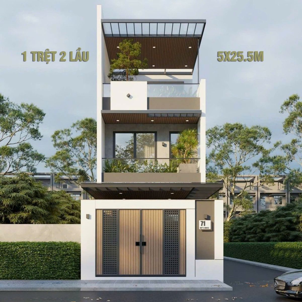Mẫu thiết kế nhà ống 3 tầng 5×20m này thể hiện sự hiện đại và tối giản thông qua việc sử dụng các đường nét sắc nét, màu sắc trung tính, tự nhiên và những vật liệu cao cấp. Không gian được tối ưu hóa để phù hợp với lối sống đô thị, mang lại cảm giác thoáng đãng và tiện nghi.