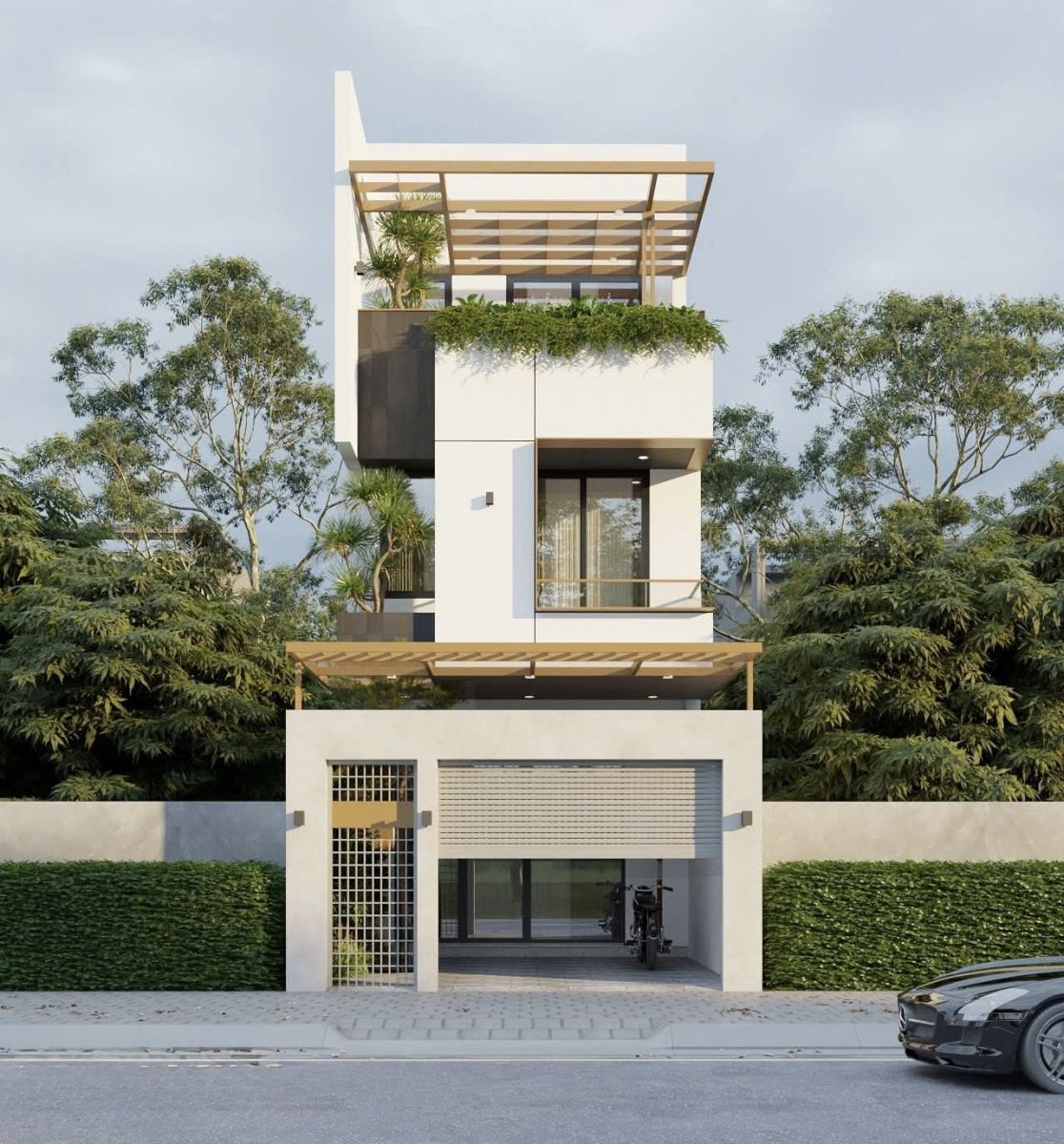 Với chiều ngang 4m, việc tạo cảm giác thông thoáng là yếu tố quan trọng. Mẫu thiết kế nhà 3 tầng 4x20m hiện đại sử dụng mảng tường lớn kết hợp kính và lam gỗ, giúp mặt tiền có chiều sâu và giảm cảm giác hẹp ngang.