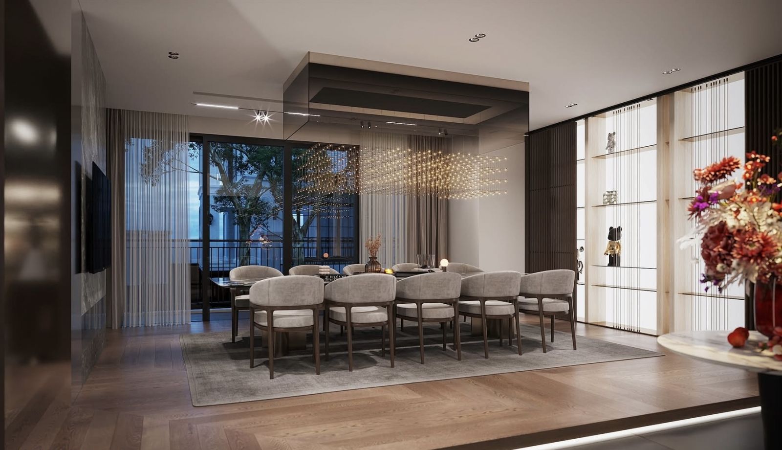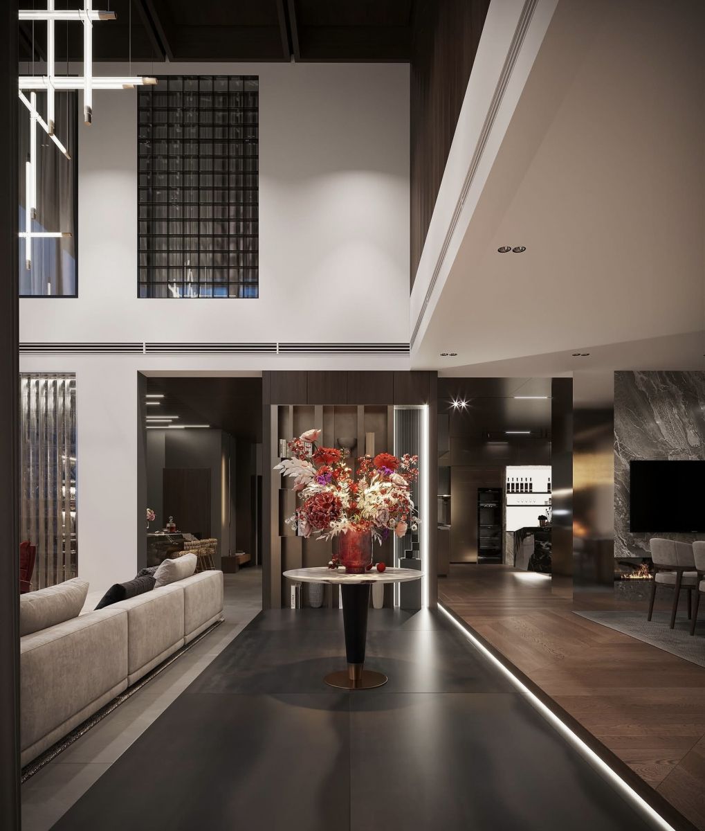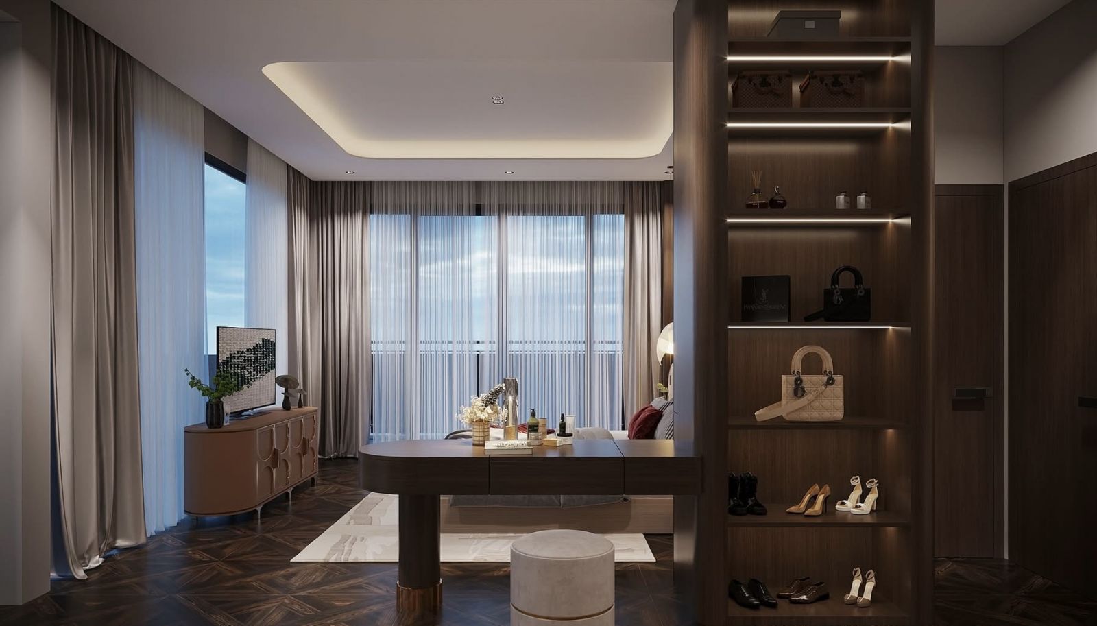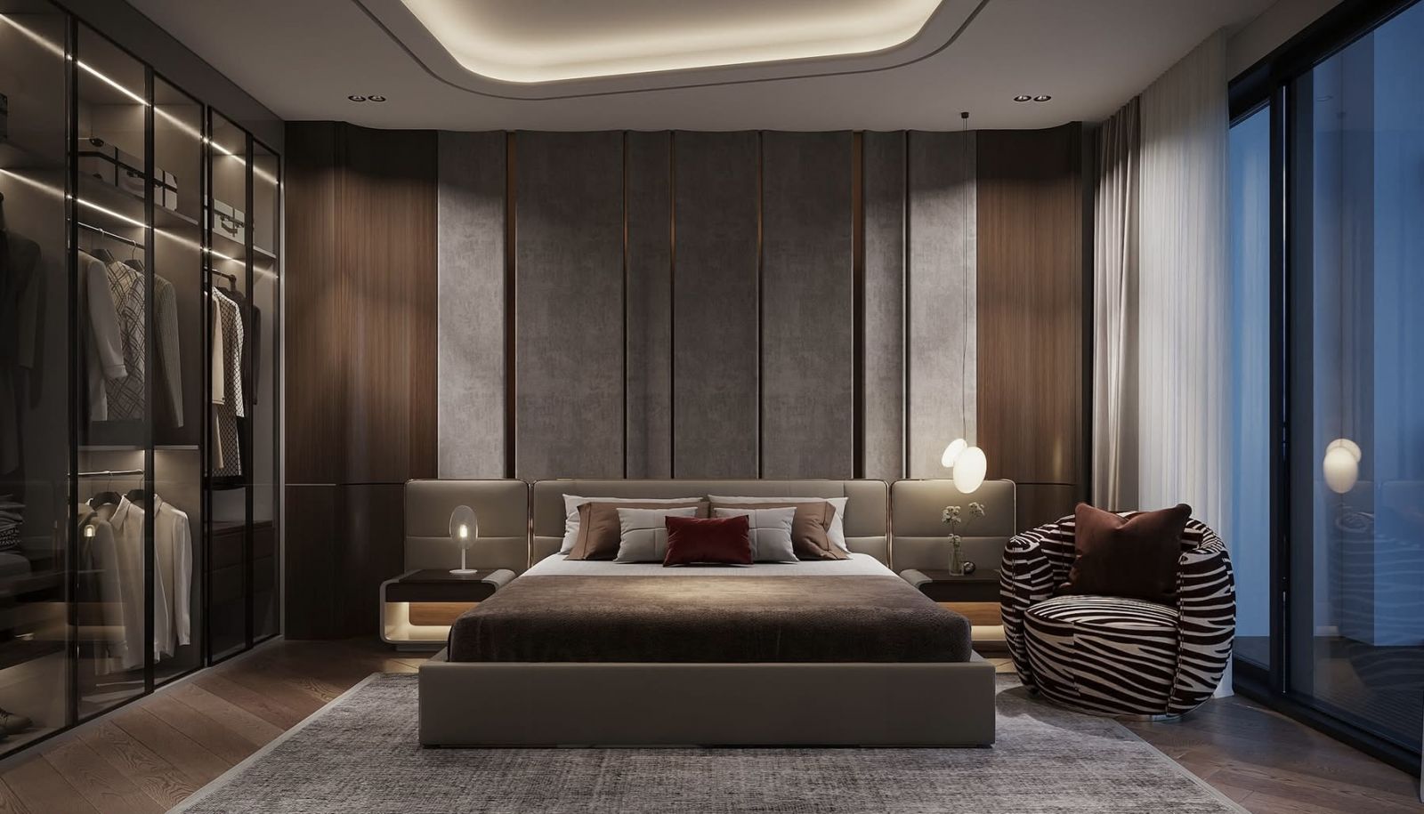Một không gian sống được thiết kế hòa quyện sự sang trọng và ấm cúng. Gam màu trầm tạo nên một nền tảng vững chắc cho sự thanh lịch và hiện đại. Mỗi chi tiết trong căn hộ đều được chăm chút tỉ mỉ, từ các vật liệu cao cấp đến ánh sáng tinh tế, mang đến một cảm giác thoải mái và gợi mở cho người ở.